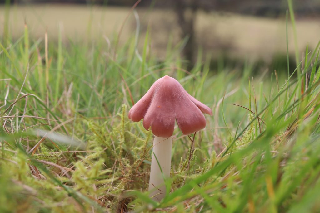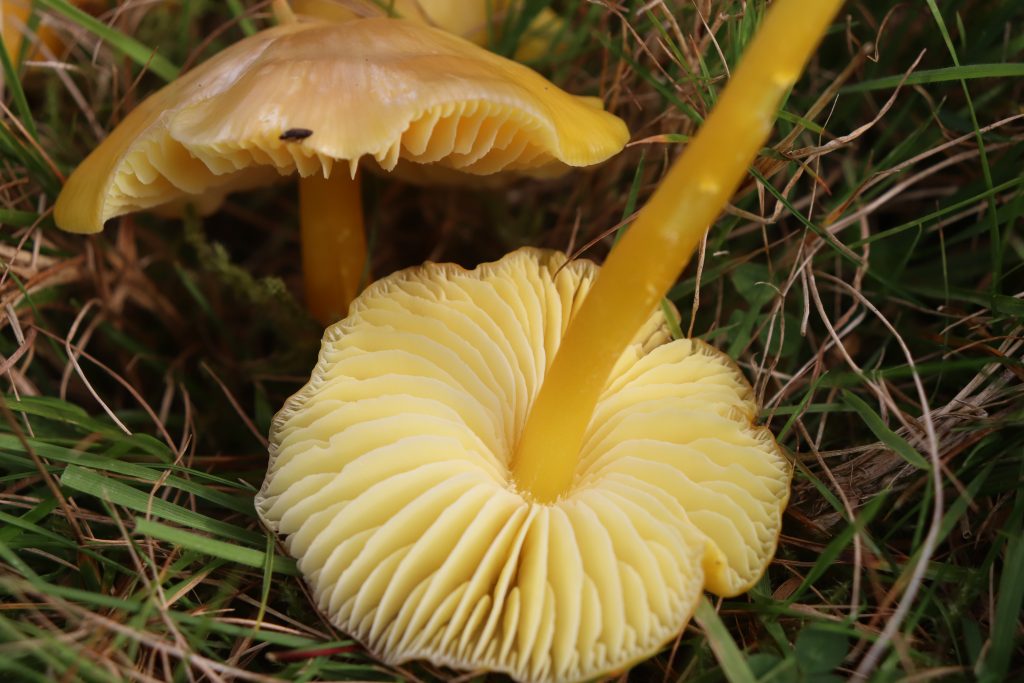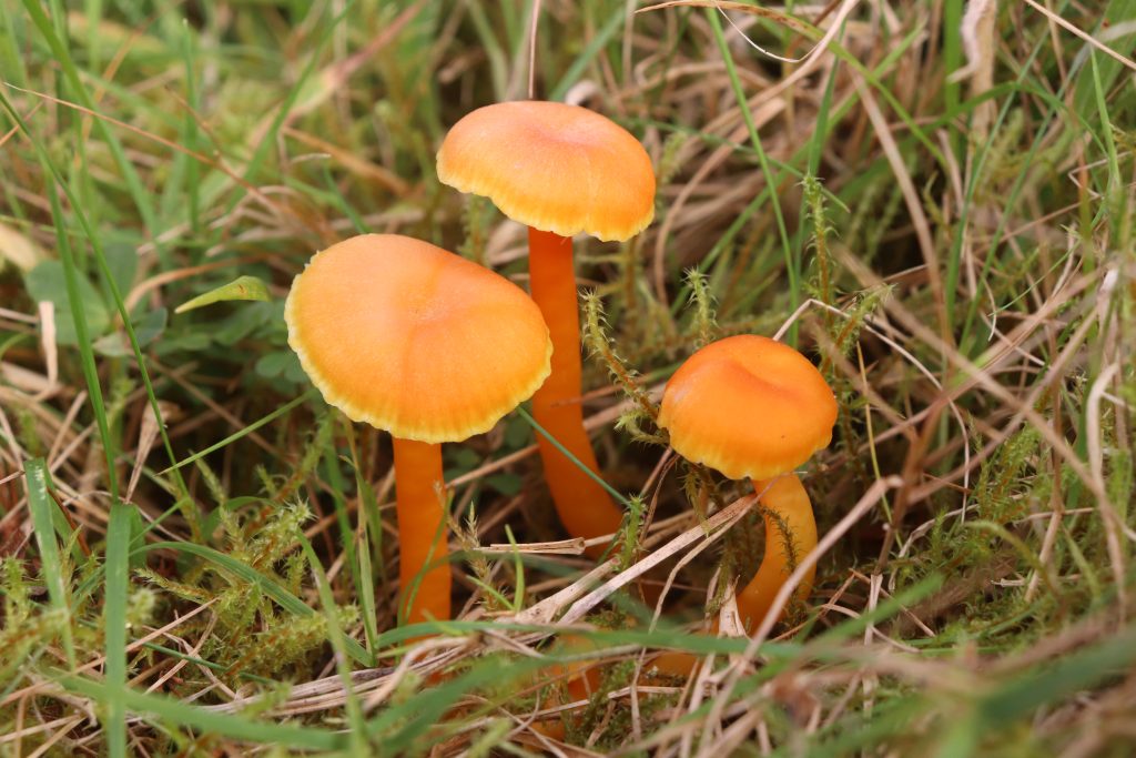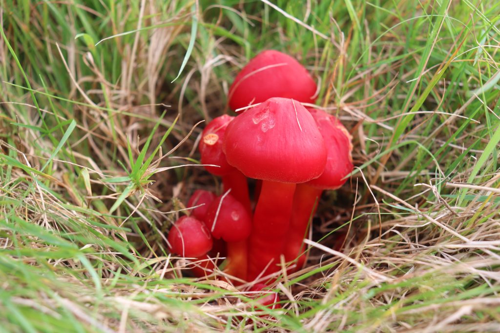 Waxcaps are a family of brightly coloured grassland fungi, often with waxy or slippery-looking caps. They range from deep red and scarlet colours, to shades of orange, yellow, green, brown, grey and even pink! They are found in low nutrient grasslands that haven’t been agriculturally ‘improved’ – not ploughed or fertilised, meaning the organically managed permanent pasture in Waun Las NNR is well suited. Grasslands in Wales are particularly important for these species and may be amongst the best places in the world to find these rare grassland fungi.